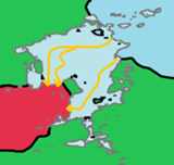(アクスンド共和国が実行した、ヴェトイェ作戦の内容を図で表したもの。青がアクスンド共和国、紅色がボメト社会主義国。そして黄色の矢印が、アクスンド共和国の戦艦ルート)