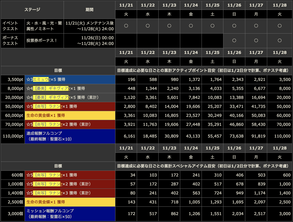 | イベント クエスト | 火・水・風・光・闇 属性ノミネート | 11/21(火) メンテナンス後 〜11/28(火) 24:00 | ○ | ○ | ○ | ○ | ○ | ○ | ○ | ○ |