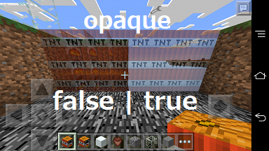 | false 1.隣接ブロックは描画する 2.光は透過する | true 1.隣接ブロックは描画しない 2.光は一切透過しない |