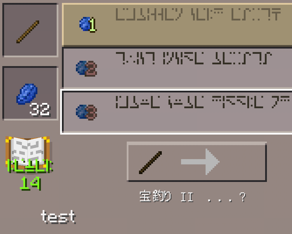 //追加したアイテム(ID:2000)に釣竿のエンチャントがつけられるようにする。 ModPE.setItem(2000, "stick", 0, "test", 1); Item.addCraftRecipe(2000, 1, 0, [3,1,0]); Item.setEnchantType(2000, EnchantType.fishingRod, true);