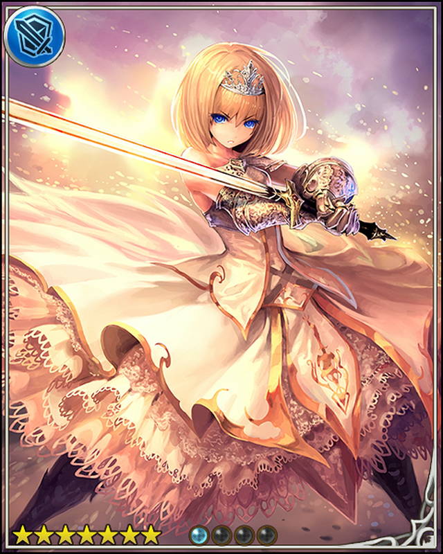 | 可憐なる白き花弁が混濁の大地に舞い降りた。かくして、憎悪と狂乱に包まれし戦乱の大地に白き道は創られた。 | 戦場に舞い散る純白の花弁は、汚泥に呑まれた戦場を斬り裂き進む。舞い踊る白刃の前に、悪しきはただ潰えゆく。 | 咲き誇る白きフルールの如く、彼女は弱きを護り、悪しきを斬って戦場に舞った。王家は武勲と気高き行いを讃えた。 | 佇む姿は淑女にして、剣と舞う姿は一閃の光刃。王家の象徴たる聖剣にして、類稀な現世に顕在せし聖女であった。 | 佇む姿は淑女にして、剣と舞う姿は一閃の光刃。王家の象徴たる聖剣にして、類稀な現世に顕在せし聖女であった。 |