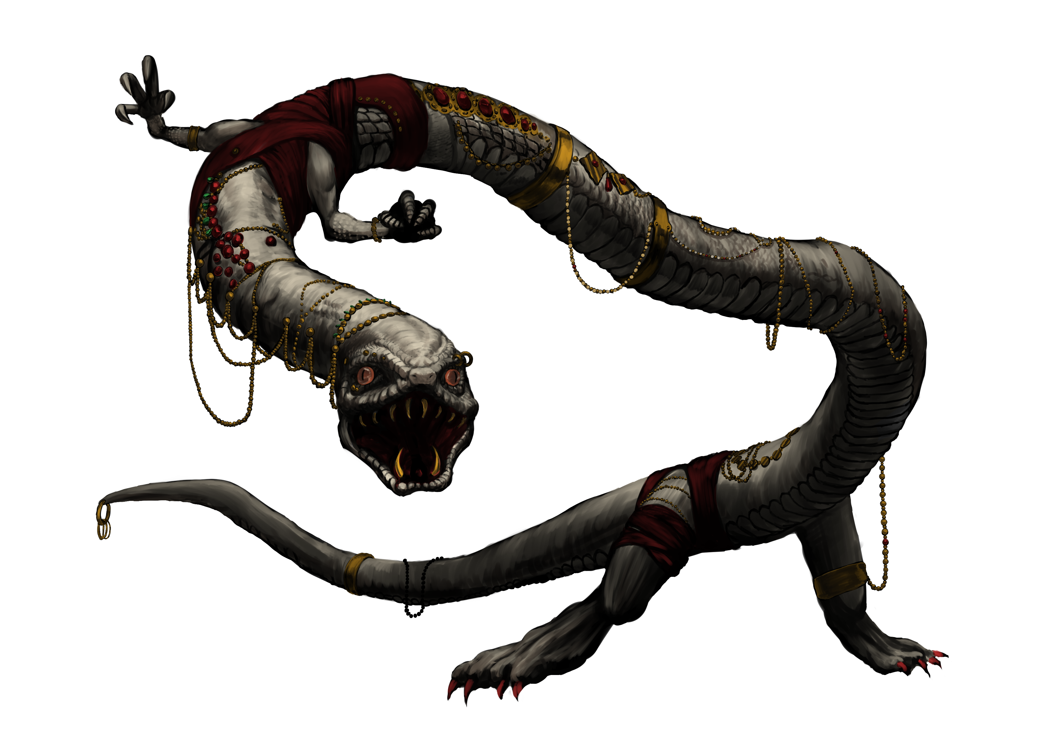 - 見た目は衣服を来た「蛇ベースのリザードマン」。爬虫類的な見た目だが恒温動物。尾を備え、毒の牙を持つ。中には毒液を吐ける亜種も存在する。鈎爪を備えているが器用で人間用の道具を支障なく扱える。