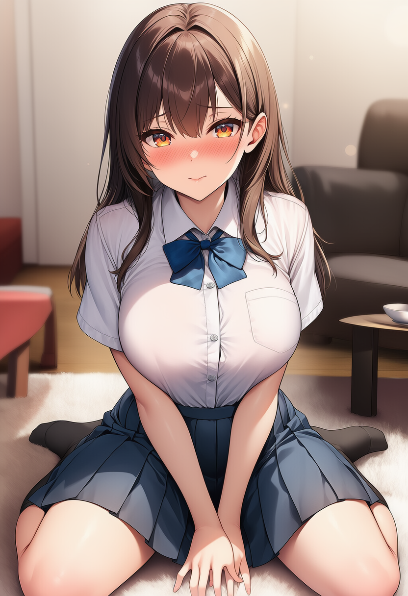 | sitting on ground, holding her knees with her arms, | 体育座り | 座り方自体を示す単語が無いので説明的なプロンプトになります。 | ![]() | 編集 | |