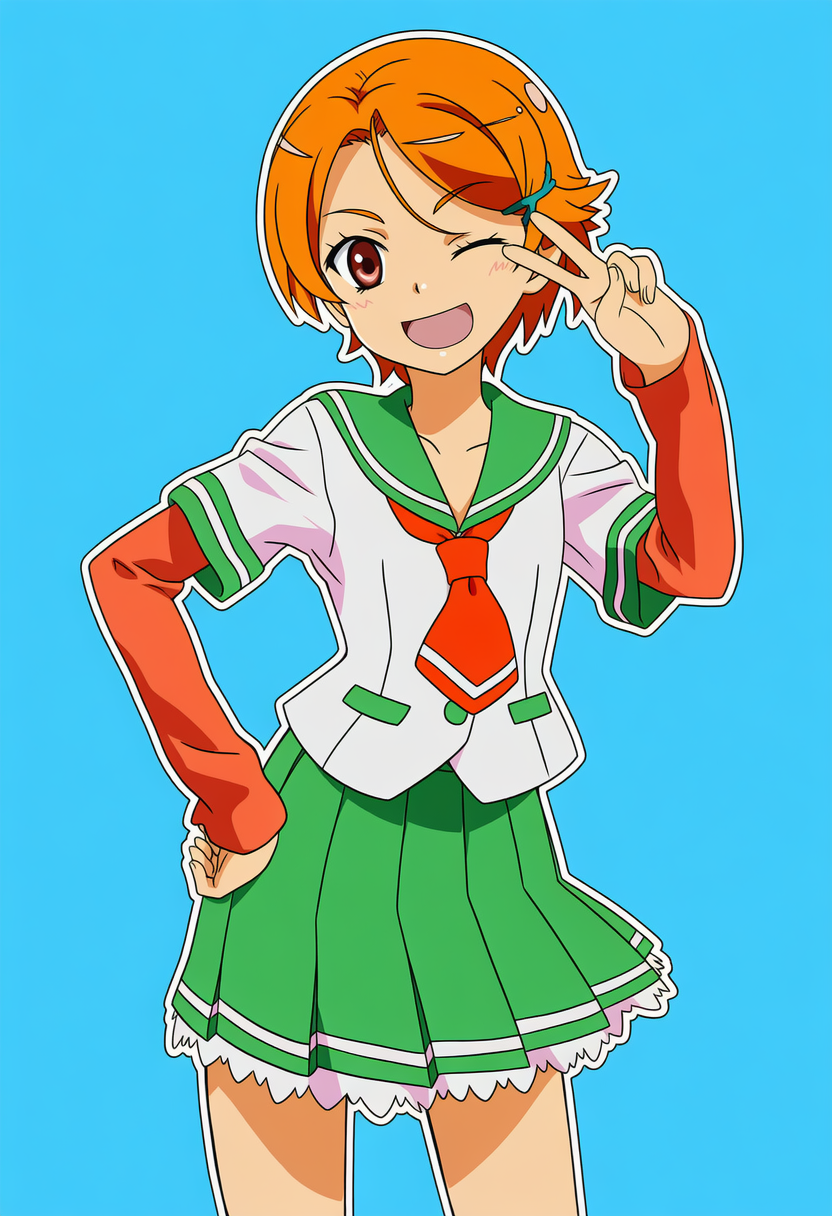 | official style,2d cel anime,,,,Uniform, peace sign, smile, wink,1girl,,,,,,,Natsuiro Kiseki,Aizawa Natsumi,Orange hair, | 夏色キセキ | 逢沢 夏海 | V4.5 | ? | 編集 | |