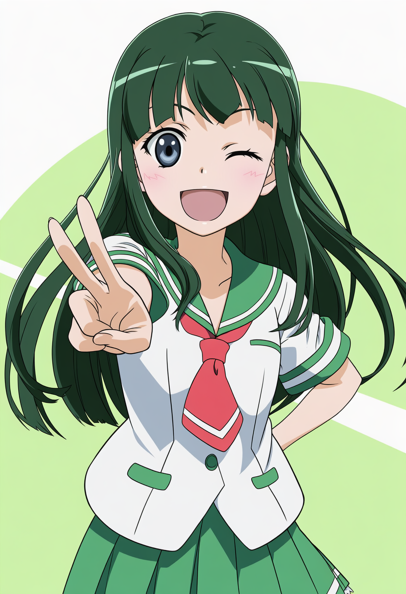 | official style,2d cel anime,Uniform, peace sign, smile, wink,1girl,Natsuiro Kiseki,Hanaki Yuka,Green hair, long hair, | 夏色キセキ | 花木 優香 | V4.5 | ? | 編集 | |