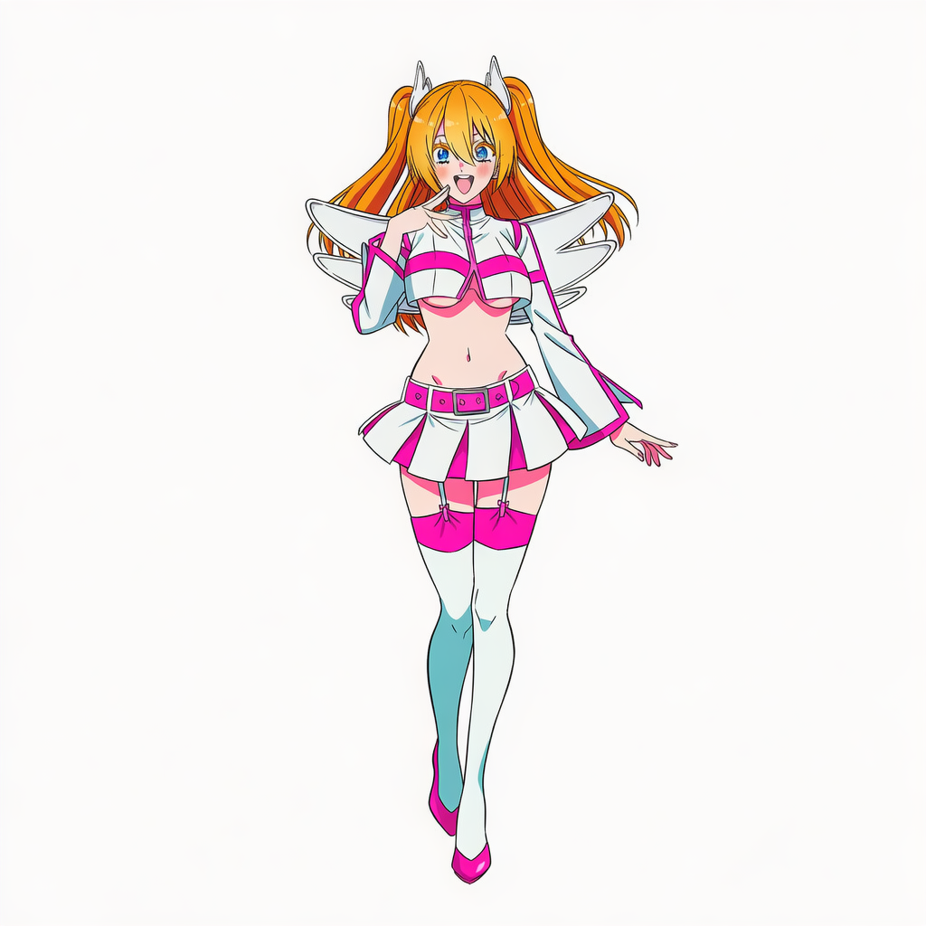 | official style,anime coloring,Amano Ririsa,Liliel(nitengojigen_ririsa), long hair, orange hair, wing hair ornament, two side up, hair between eyes, blue eyes,crop top, white shirt, underboob, long sleeves, wings, midriff, navel, pink belt, miniskirt, garter straps, white thighhighs, pink heels,standing,simple background,full body | 2.5次元の誘惑 | 天乃 リリサ(リリエル) | V4.5使用 | ![]() | 編集 | |