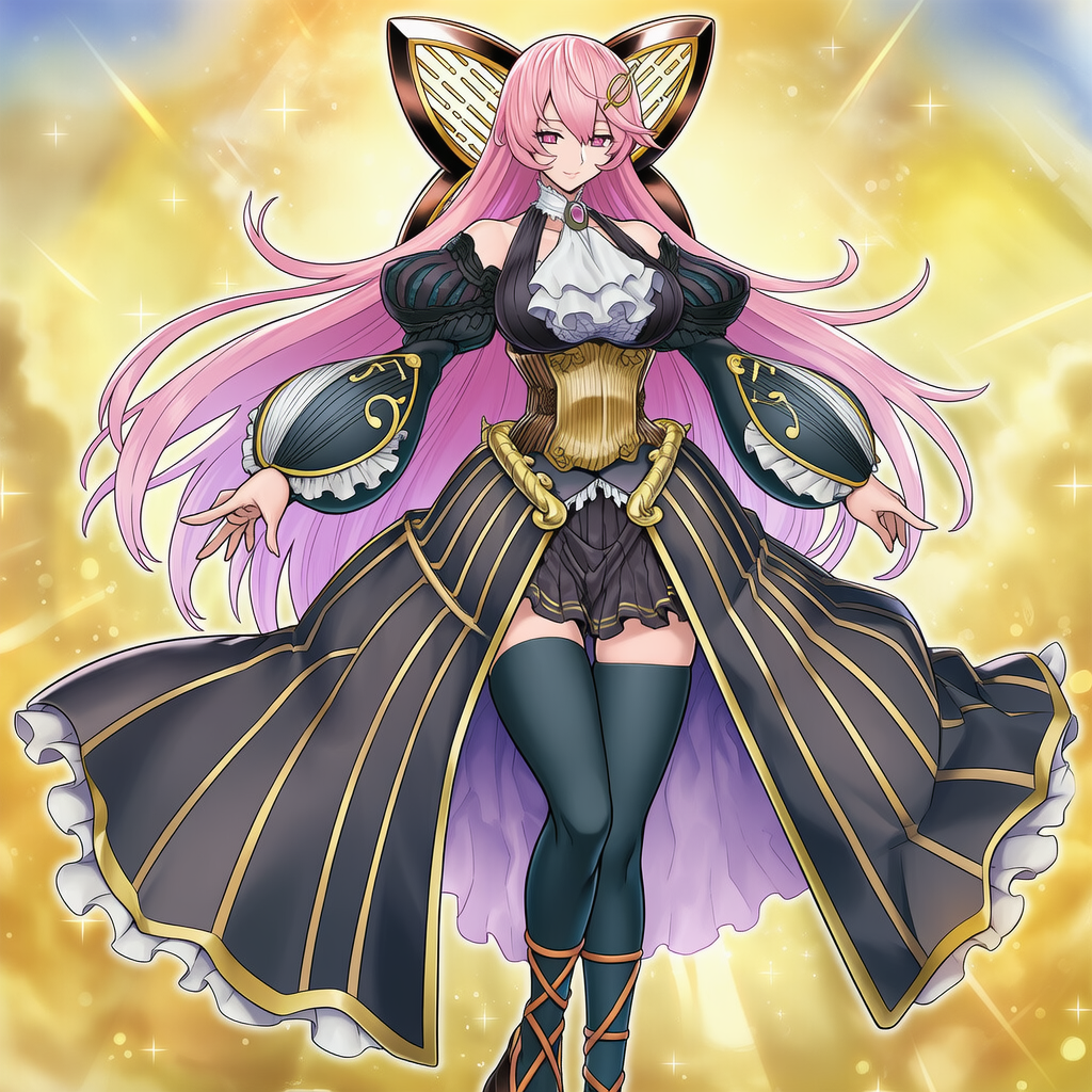 | 8k,official style,anime coloring,selettrice vaalmonica, yu-gi-oh!,1girl,white princess dress, black bowtie, black corset, single black thighhigh, gold shoes | | 遊戯王 | 天魔の聲選姫 | V4使用 |  | 編集 |