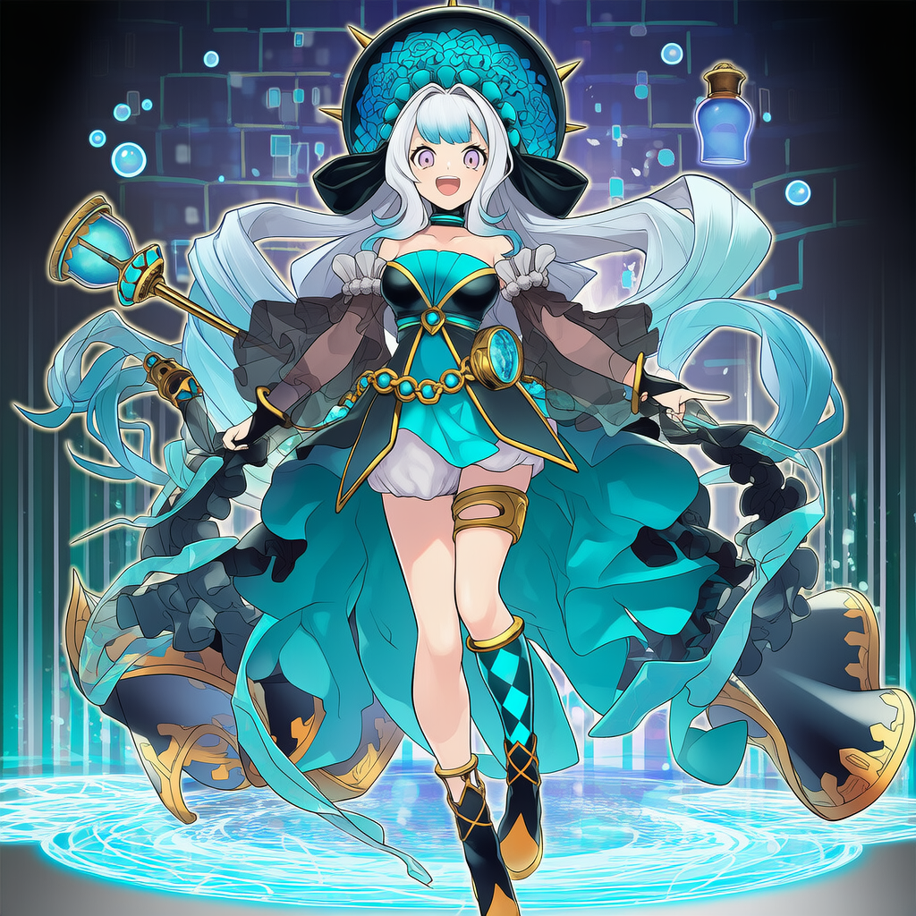 | 8k,official style,anime coloring,Water Enchantress of the temple,yu-gi-oh!,Light blue hair,blue witch hat, witch dress, blue detached sleeves, white thighhighs, gold footwear,staff, holding staff | | 遊戯王 | 聖殿の水遣い | V4使用 |  | 編集 |