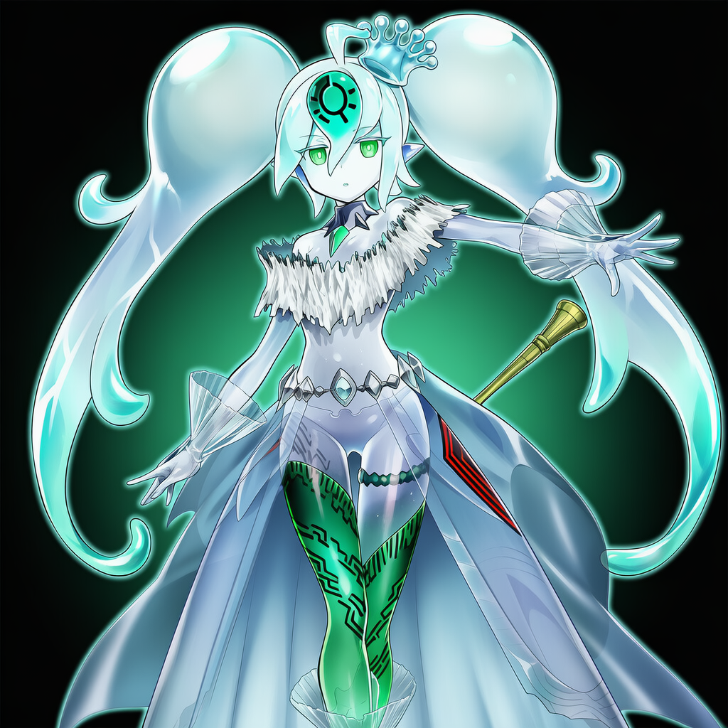 | Icejade Ran Aegirine,yu-gi-oh!,white skin, twintails, monster girl, detached collar, mini crown, white cropped shirt, see-through detached sleeves, green thigh strap, see-through waist cape, see-through legwear,see-through body, | | 遊戯王 | 氷水帝エジル・ラーン | V4.5使用 |  | 編集 |