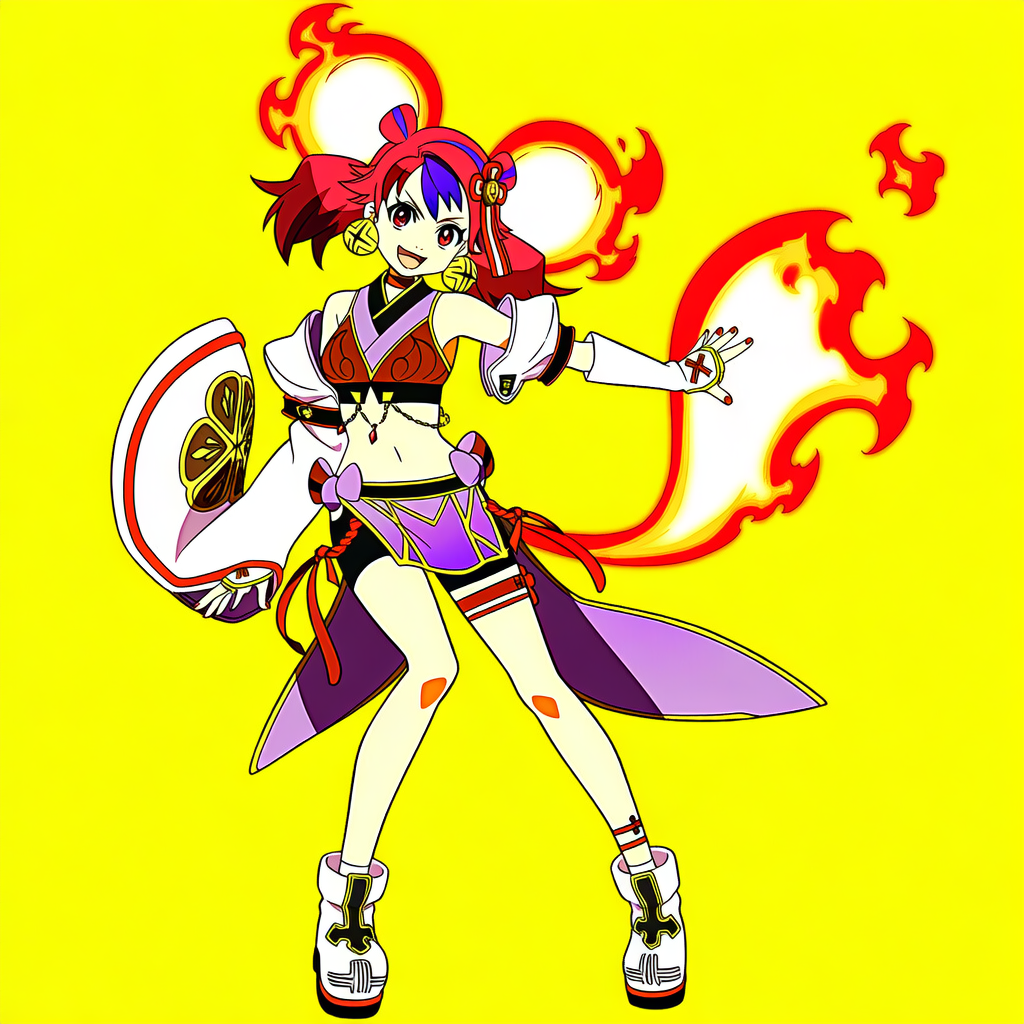 | 8k,anime coloring,official style,game cg,Ha Re the sword mikanko, yu-gi-oh!,fire mouse ears, fire mouse tail, red nails,black bike shorts, single white detached sleeve, white boots, red hair bow, white fingerless gloves, red crop top, red thigh strap, bell earrings, red choker, purple skirt | | 遊戯王 | 剣の御巫ハレ | V4.5使用 |  | 編集 |