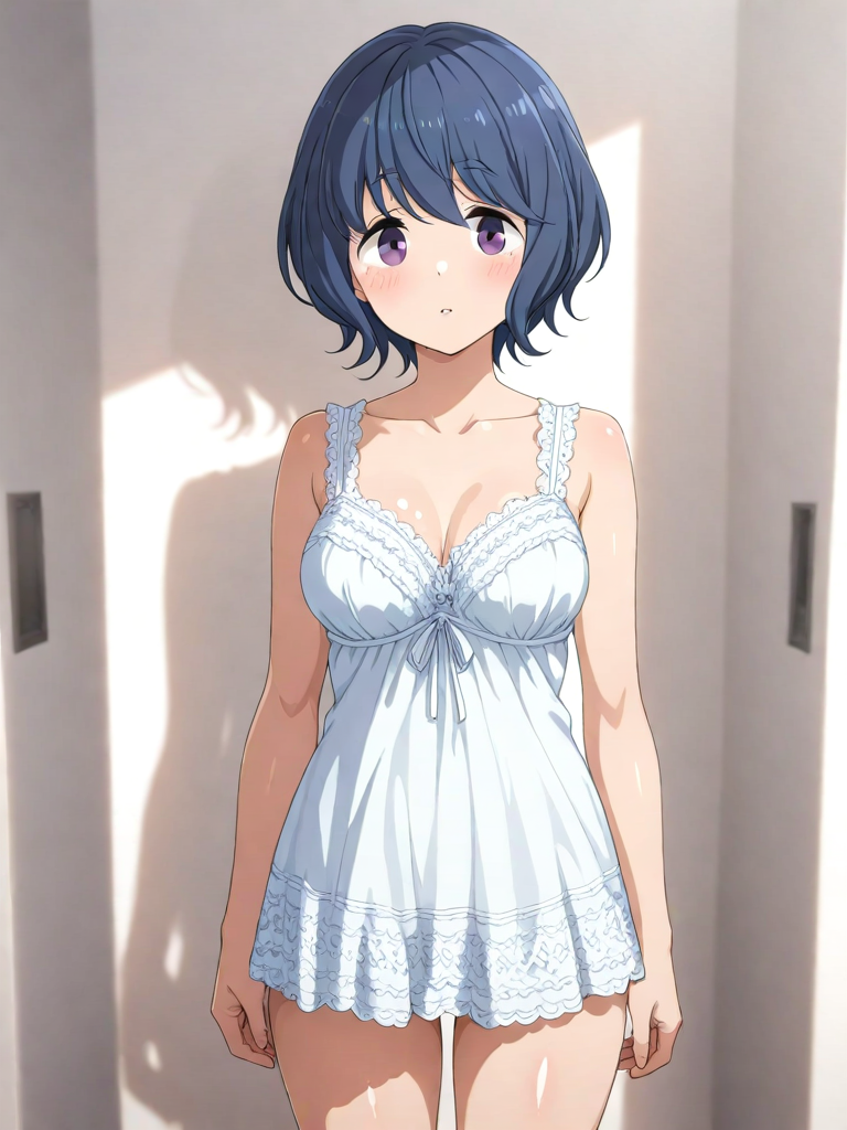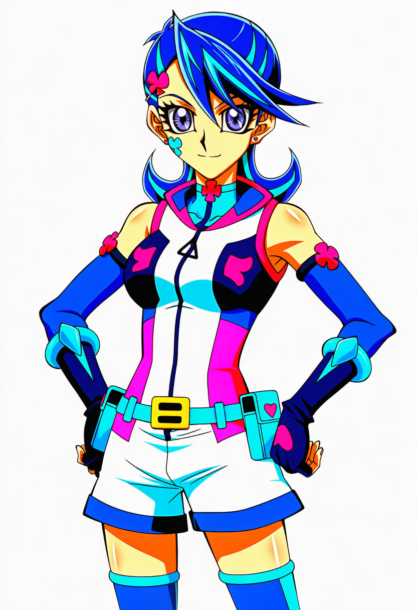| {blue girl, yu-gi-oh!, blue hair, short hair, clover facial tatoo, eyelashes, blue eyes, 1girl}, blue gloves, white shorts, detached sleeves, blue thighhighs, large breasts, shiny skin, cowboy shot, white background, anime coloring, official arts, | 3d, poorly drawn, lowers, bokeh, low quality, out of focus, ugly, censor, bar censor, puffy nipples, extra digits, long body, cubism, disfigured, poorly drawn, deformed, mutation, | 遊戯王Vrains | ブルーガール | V4.5Full使用。 |  | 編集 |