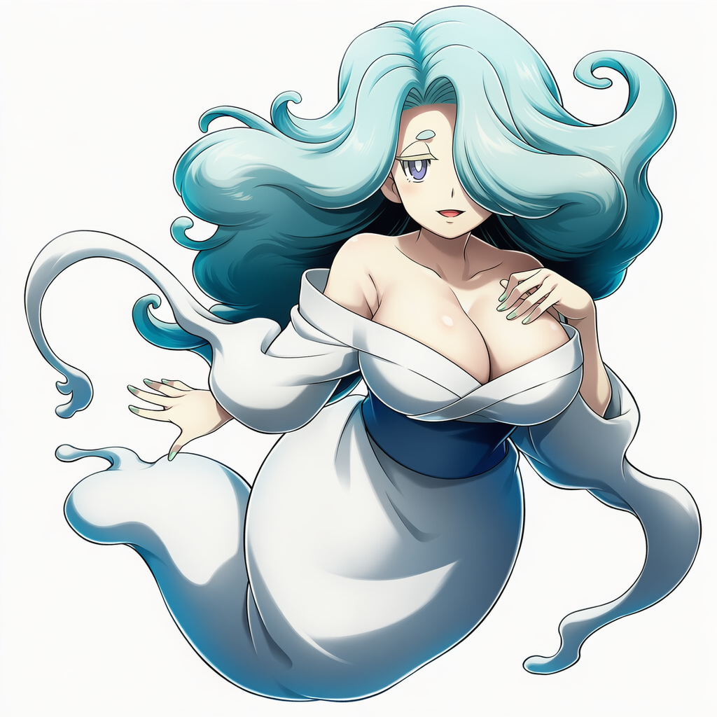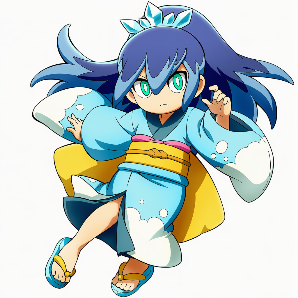 | yuki-onna the absolute zero mayakashi, yu-gi-oh!,1girl,{{{{white skin}}}},white japanese clothes, black platform footwear, black thighhighs, black hair ribbon, blue bodysuit, cyan chest jewel | | 遊戯王 | 零氷の魔妖−雪女 | V4使用 |  | 編集 |