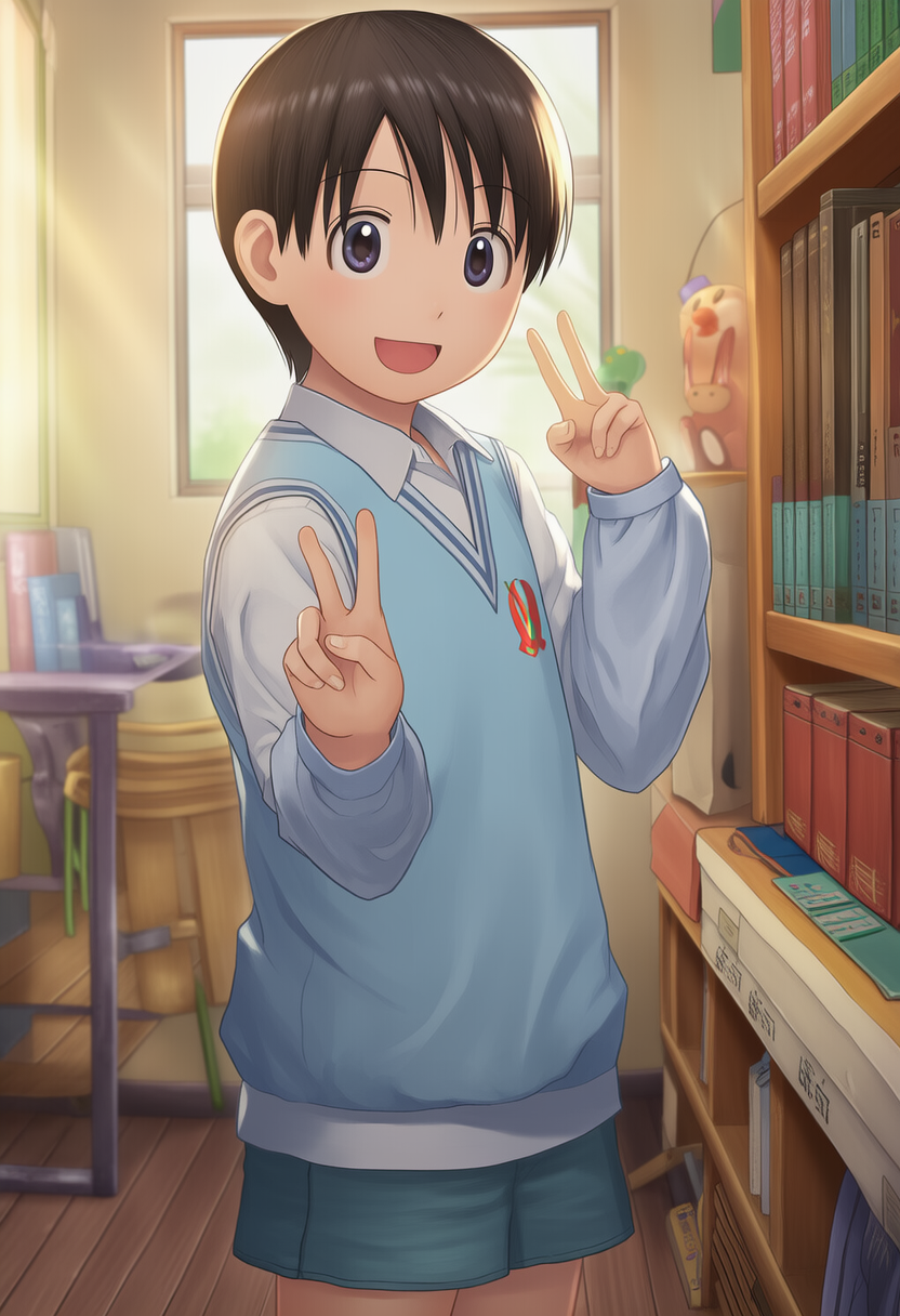| 2d cel anime, {{mutou yuugi, yu-gi-oh!}}, very aesthetic, best quality, intricate, overall detail, 1 boy, standing, light smile, simple background, front view, cowboy shot, facing the front, straight-on, solo focus, depth of field, highly detailed, | {{3d}}, poorly drawn, lowers, blurry, bokeh, worst quality, low quality, out of focus, ugly, error, jpeg artifacts, {{{{censor, bar censor}}}}, mosaic censorship, puffy nipples, extra digits, POV hands, | 遊戯王 | 武藤遊戯 | V2使用。名前だけで遊戯だとわかるキャラ造形になる。 |  | 編集 |