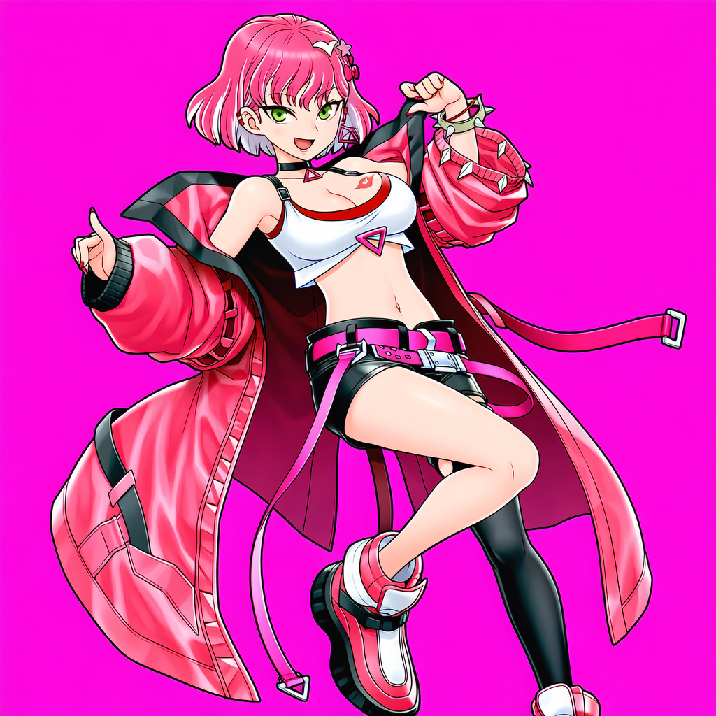 | {{{kouzuki anna}}}, {yu-gi-oh! zexal, pink hair, two-tone hair, pink sleeveless shirt}, 1girl, solo, orange hair:0.4, large breasts, pink belt, black bike shorts, hair ornament, hairclip, blue zipper, pink turtleneck, yellow eyes, white knee boots, pink miniskirt, white background, simple background, light smile, cowboy shot, intricate, hyper-detailed, 100-layer, amazing quality, excellent, {{{{ultra-high resolution}}}}, {{{hi-vision anime}}}, | 3d, poorly drawn, lowers, blurry, bokeh, worst quality, low quality, out of focus, ugly, error, jpeg artifacts, {{censor, bar censor}}, mosaic censorship, puffy nipples, extra digits, long body, cubism, bad anatomy, disfigured, poorly drawn, deformed, mutation, | 遊☆戯☆王zexal | 神月アンナ | V3使用。衣装が安定しない |  | 編集 |