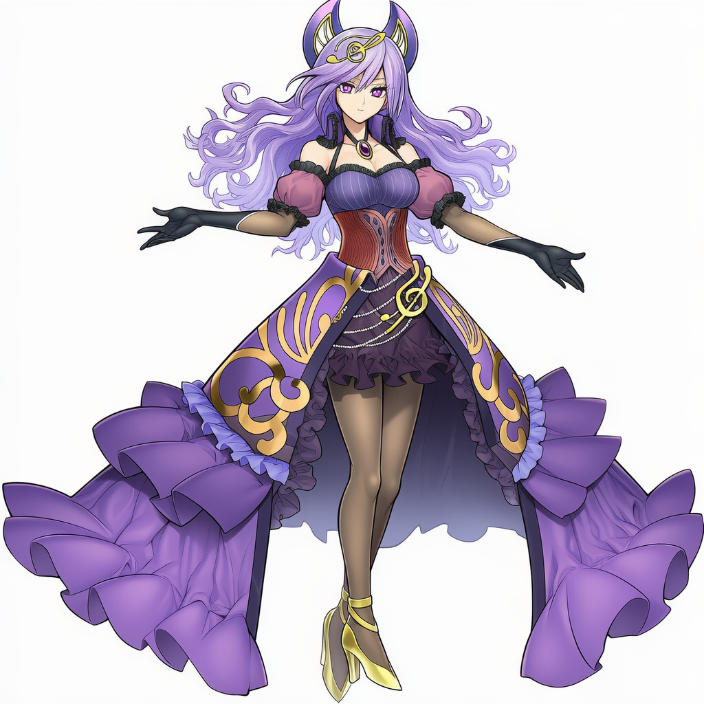 | SolSolfachord Gracia,yu-gi-oh!,musical note hair ornament, purple detached collar, purple frilled dress, purple corset, purple puffy sleeves, black elbow gloves, black pantyhose, gold high heels, | | 遊戯王 | ソドレミコード・グレーシア | V4.5使用服が完全ではないがそれっぽく出力 |  | 編集 |