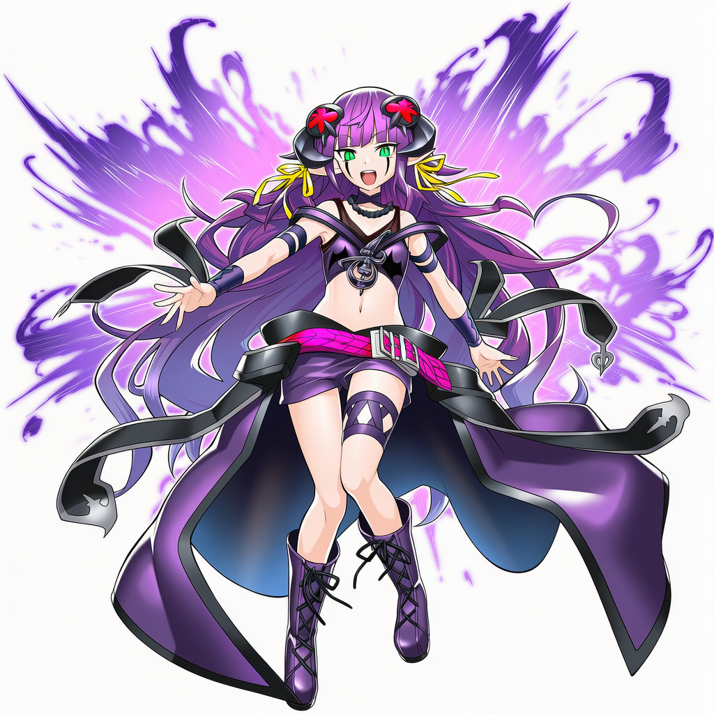 | 8k,anime coloring,official style,game cg,Knightmare Corruptor Iblee,yu-gi-oh!,demon girl, facial mark,revealing clothes, purple short shorts, purple thigh strap, purple cross-laced footwear, purple choker, red hair ornament, purple wristband, yellow hair ribbon, purple dress | | 遊戯王 | 夢幻崩界イヴリース | V4.5使用 |  | 編集 |