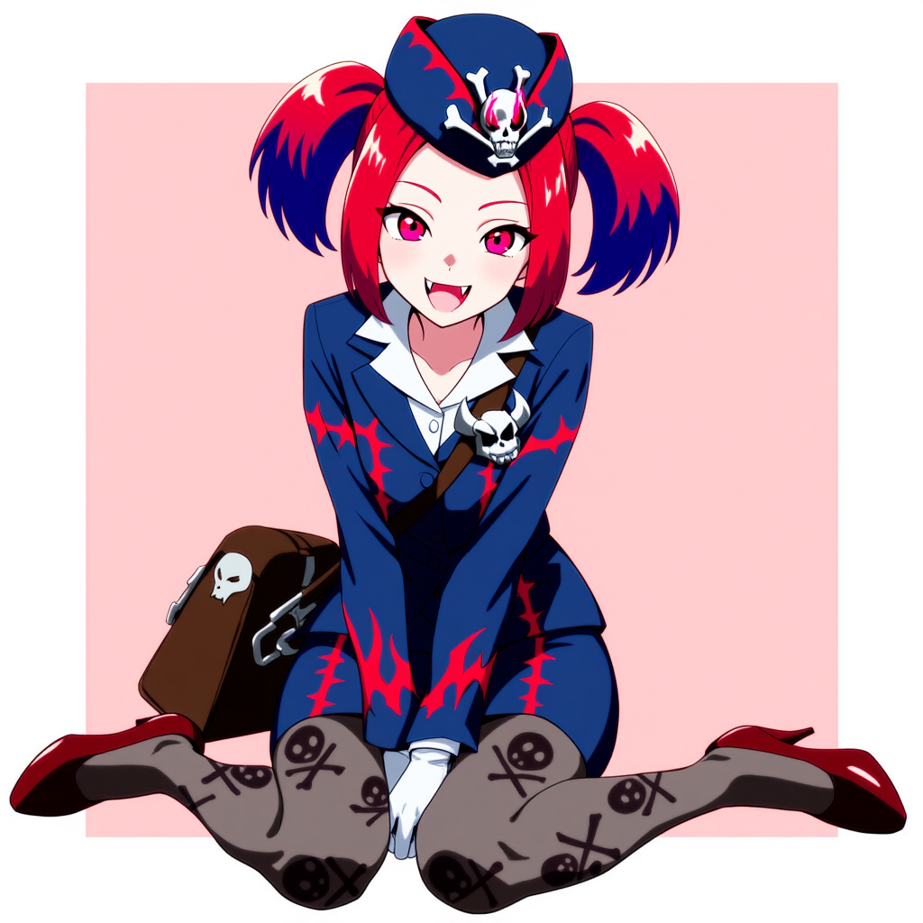 | 8k,official style,anime coloring,tour guide from the underworld,yu-gi-oh!, fangs,Twin tails,handbag,blue headwear, blue jacket, white shirt, blue pencil skirt, white gloves, skull print pantyhose,red high heels, brown shoes | | 遊戯王 | 魔界発現世行きデスガイド | V4使用,V4.5生成可 |  | 編集 |