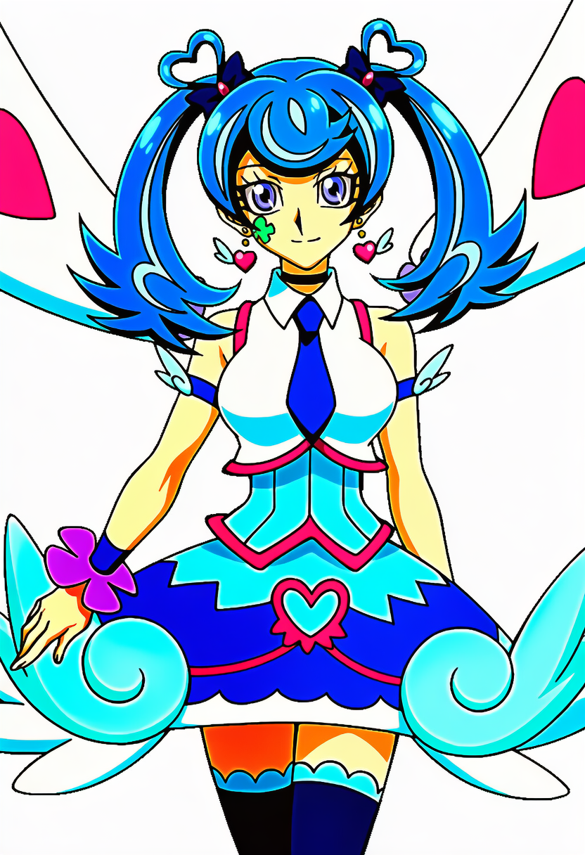 | {blue angel (yu-gi-oh!), blue hair, twintails, pink heart earrings, clover facial tatoo, eyelashes, blue eyes, 1girl}, blue necktie, blue skirt, sleeveless dress, blue choker, blue thighhighs, white collared shirt, wings, large breasts, shiny skin, cowboy shot, white background, anime coloring, official arts, | 3d, poorly drawn, lowers, bokeh, low quality, out of focus, ugly, censor, bar censor, puffy nipples, extra digits, long body, cubism, disfigured, poorly drawn, deformed, mutation, | 遊戯王Vrains | ブルーエンジェル | V4.5 Full使用。 |  | 編集 |