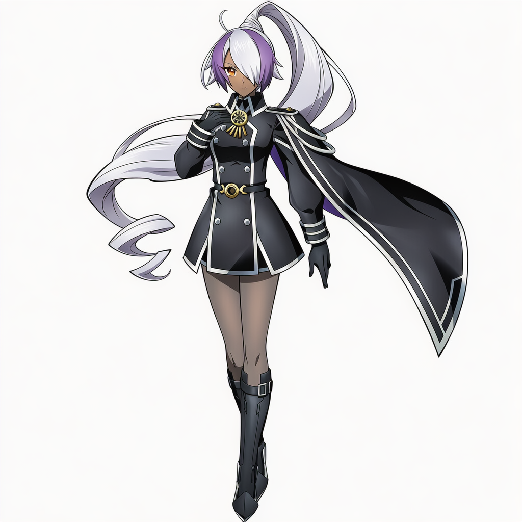 | 8k,anime coloring,official style,game cg,sky striker ace - azalea, yu-gi-oh!,dark-skinned female,one eye covered, hair between eyes, high ponytail, hair over eye, floating hair,black military uniform, black gloves, silver medal, left side cape, black pantyhose, black boots | | 遊戯王 | 閃刀姫−アザレア | V4.5使用 |  | 編集 |
