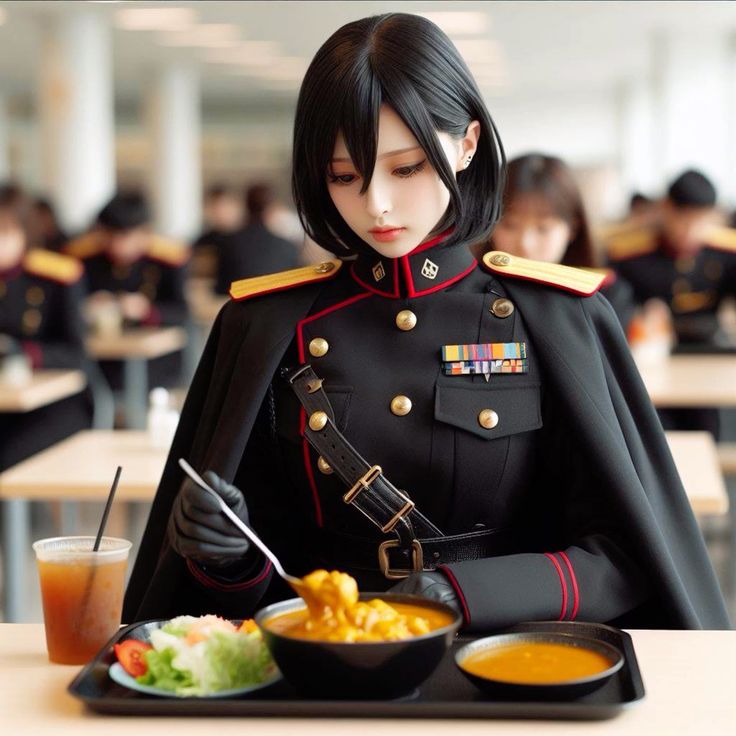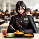 新人の男性軍人や女性軍人も同じメニューを楽しんでいました。彼らは訓練の疲れを癒すために、笑顔で食事を楽しんでいました。 りんごとナナも、そんな新人たちの姿を見て、自分たちの新人時代を思い出し、微笑みました。
