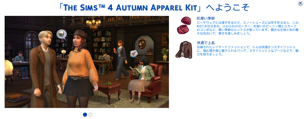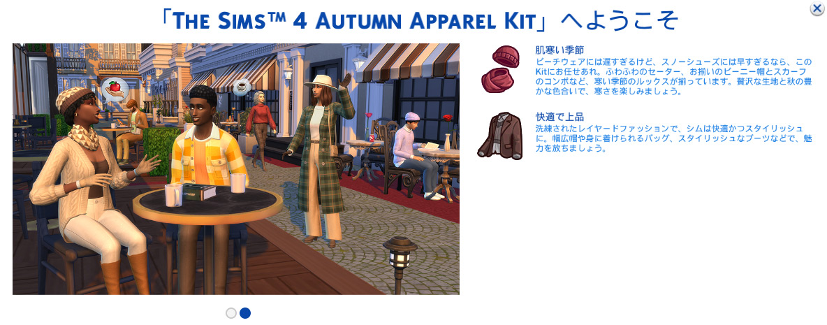 「The Sims™ 4 Autumn Apparel Kit†」で、キンと冷えた空気を吸って、葉の色が変わるのを眺め、温かい服装に衣替えしましょう。