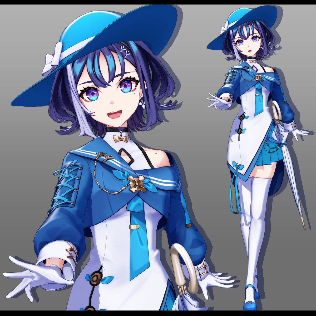 全体的に青と白を基調とした衣装で、腰から傘を下げている。