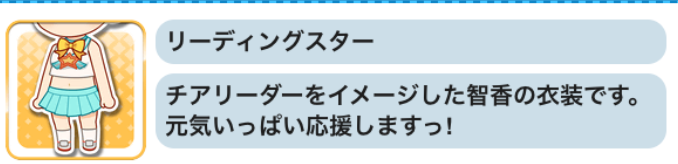 ガチャで入手した場合は初期Rの特訓後衣装「チアフルシャイニースター」をぷち衣装として入手可能。
