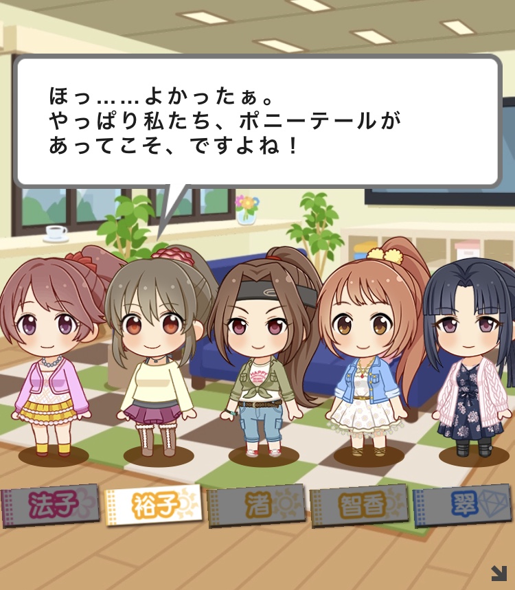 2月19日にリフレッシュルーム「集まれ☆ポニーテール乙女同盟」が公開。智香がいないことに気づいた裕子と法子がポニーテール乙女同盟を脱退し編み込み乙女同盟に加入するのではと狼狽えていた。編み込み乙女同盟とは一体…