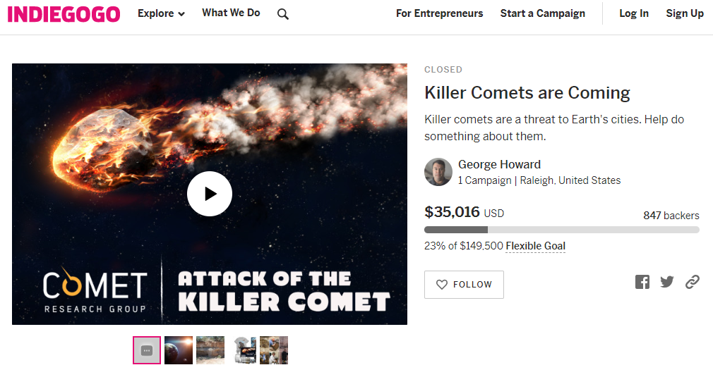 Killer Comets are Coming … Killer comets are a threat to Earth’s cities. Help do something about them … Killer comets are more common than you’ve been taught. Our mission is to prove it and to do something about it before your city is next … We are in serious danger, but with your help we can do something about it.