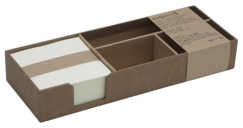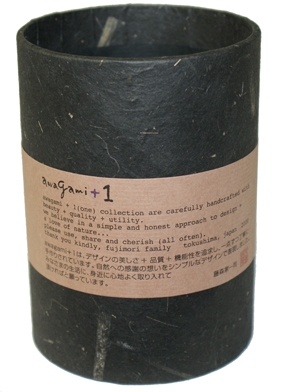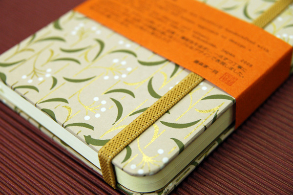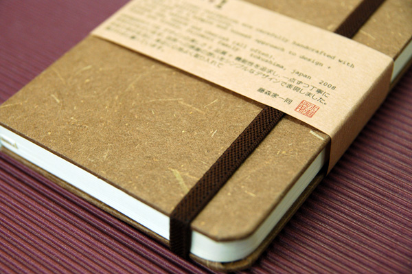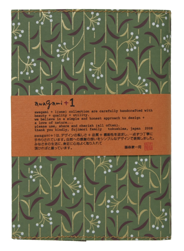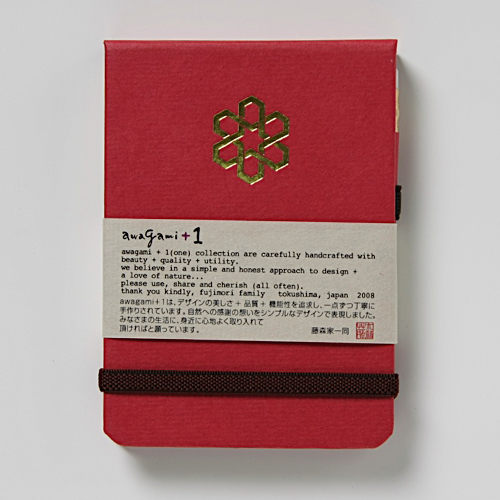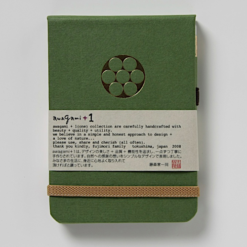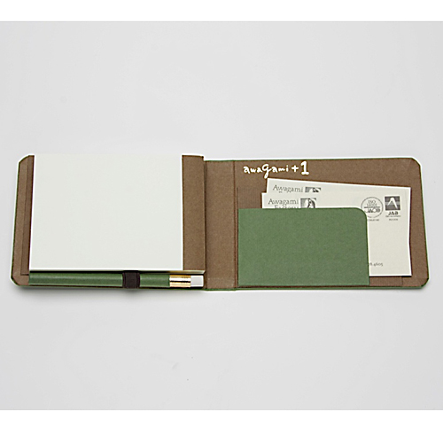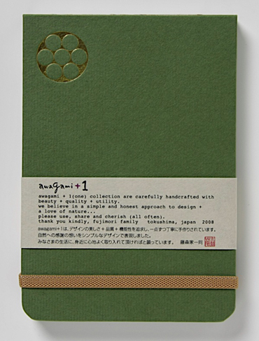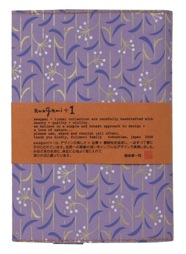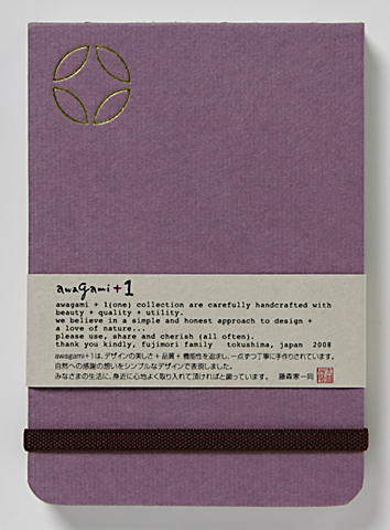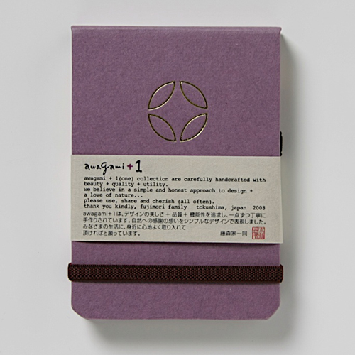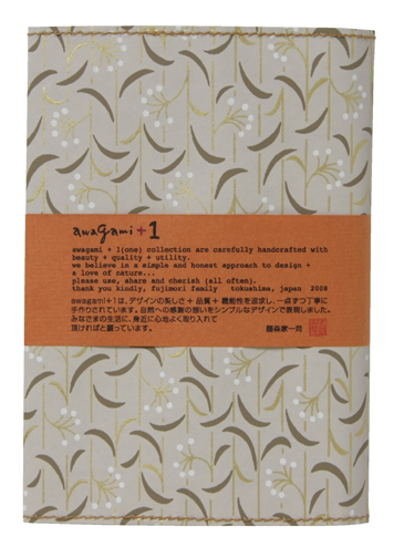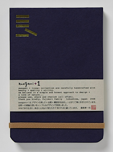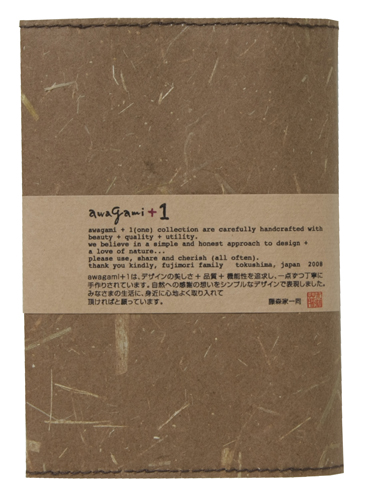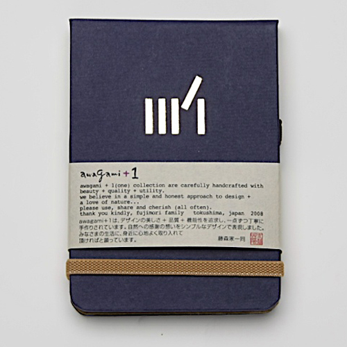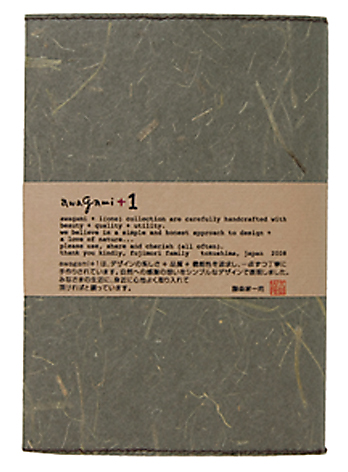 ![]() 中紙は少しクリームがかった無地です | ![]() 表紙裏にはawagami+1が刻印されています |