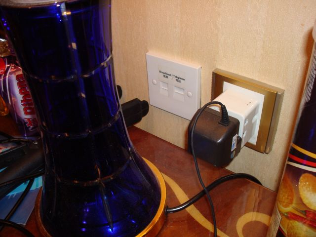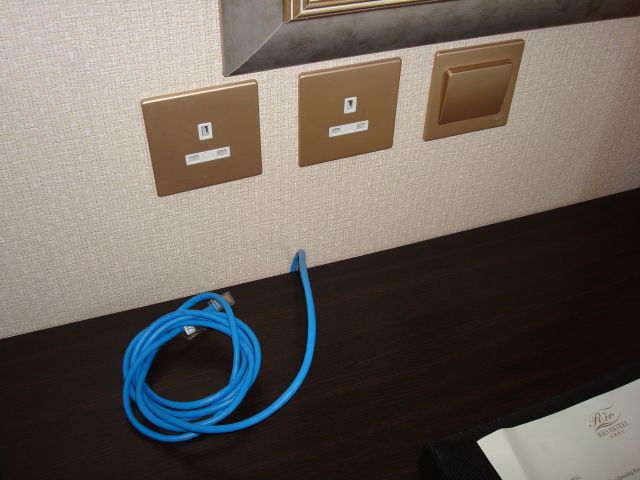 | 1703号室。デスクにある電源プラグ、日本型と平型3つ足。CTMのWifiLAN。 | ||