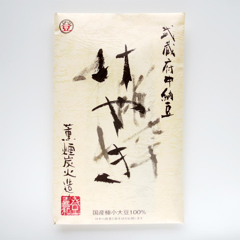 側書き:茨城県産極小大豆100% / 燻煙炭火造り