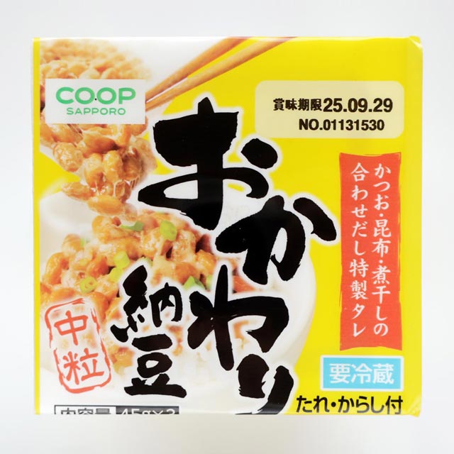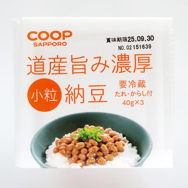 | 夕鶴(オシキリ) 豆蔵を継承するまぼろしの... | 道産旨み濃厚小粒納豆 コープさっぽろのオリジナル | おかわり納豆中粒 コープさっぽろの普及品 | ドライ小粒納豆うす塩味 バキュームフライ製法 |