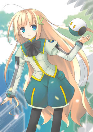 金髪のストレートロング髪、VISTAロゴの髪飾りを付けている。