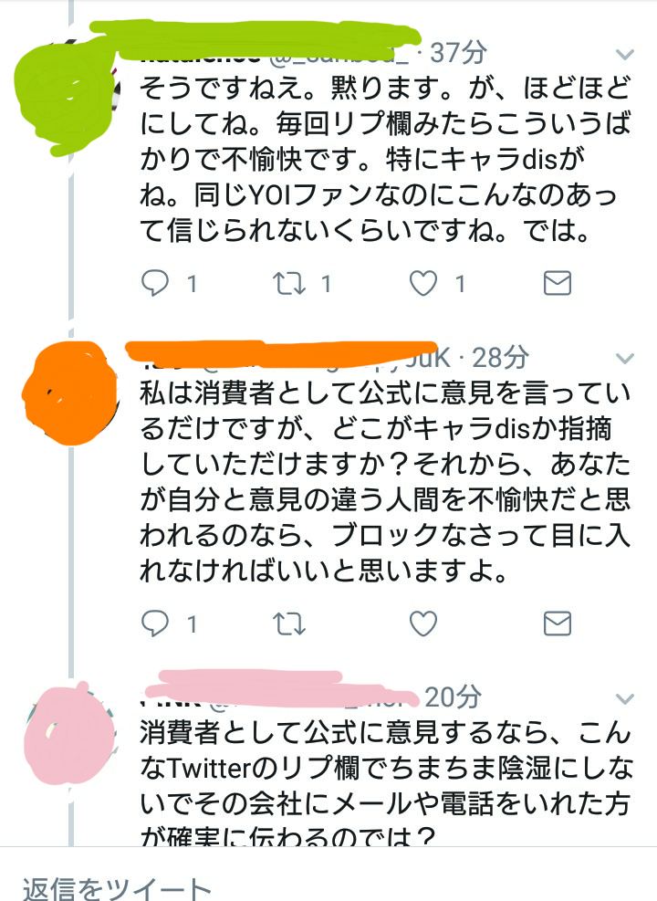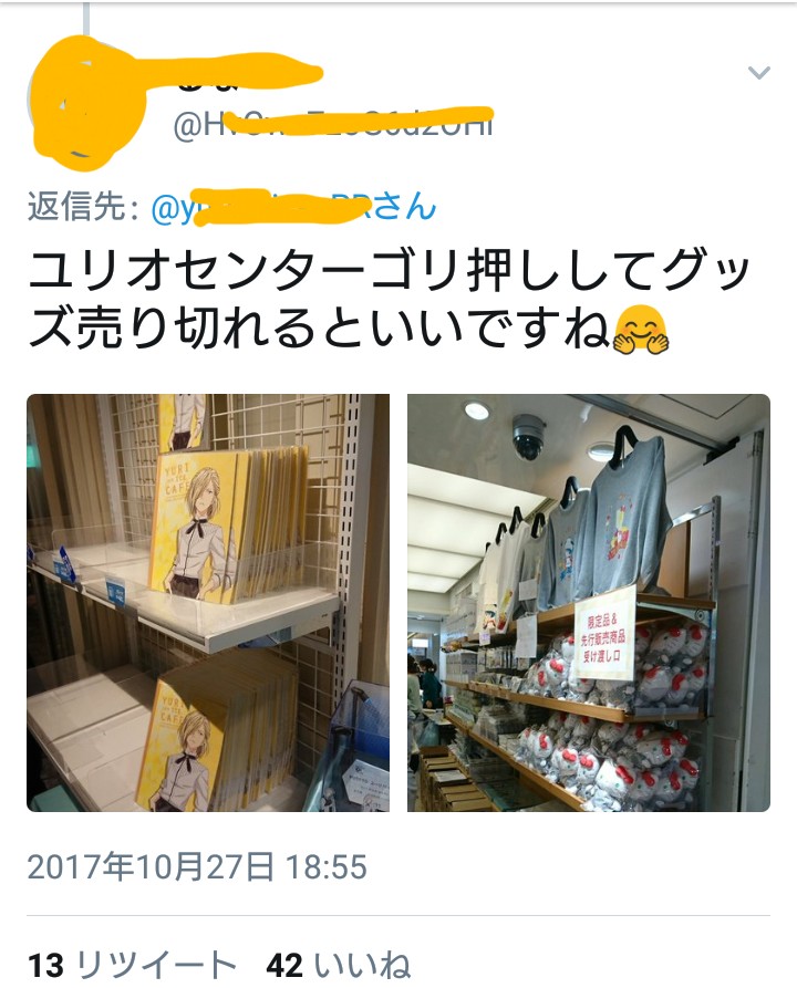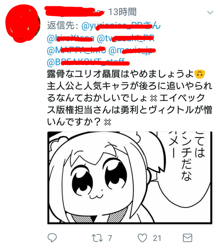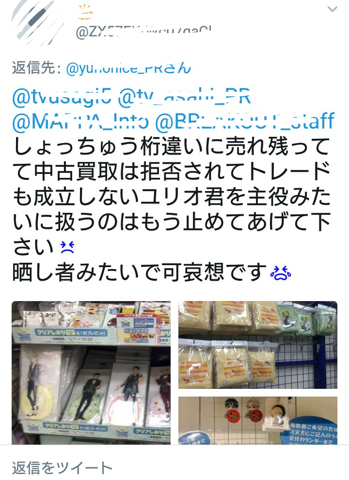 これはもう無法地帯だ。ユーリ・プリセツキーの売り場写真を添付したり、ポピ○ピピックの画像で小馬鹿にするようなリプライを飛ばしたり、主旨は既に嫌がらせになっている。