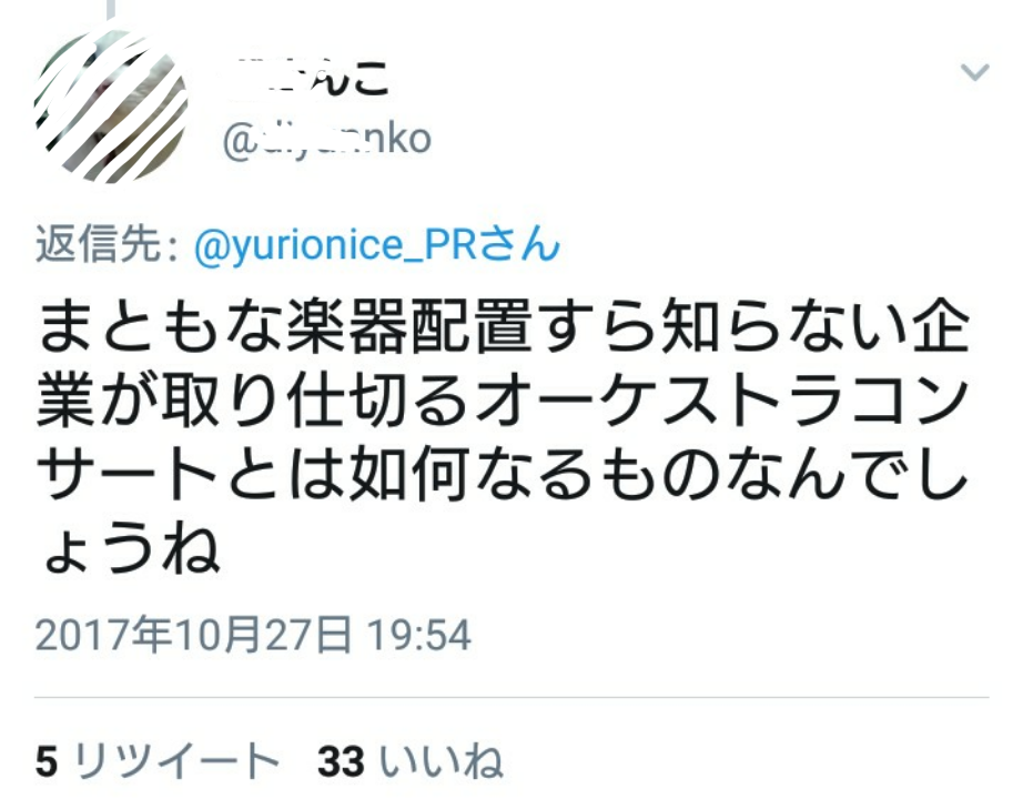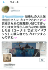 関係者にブロックされたらしい。異様な攻撃といい、巻き込みリプライといい、迷惑行為でしかないので、関係者の判断は正しい。
