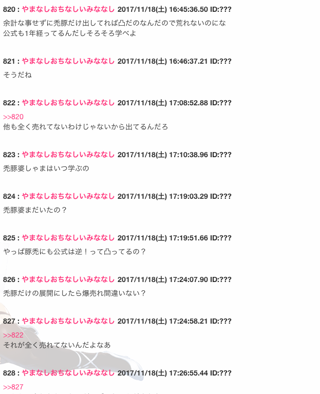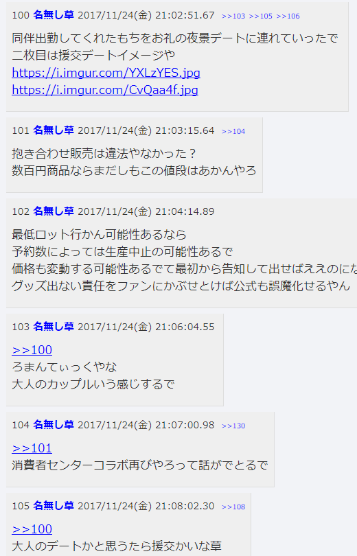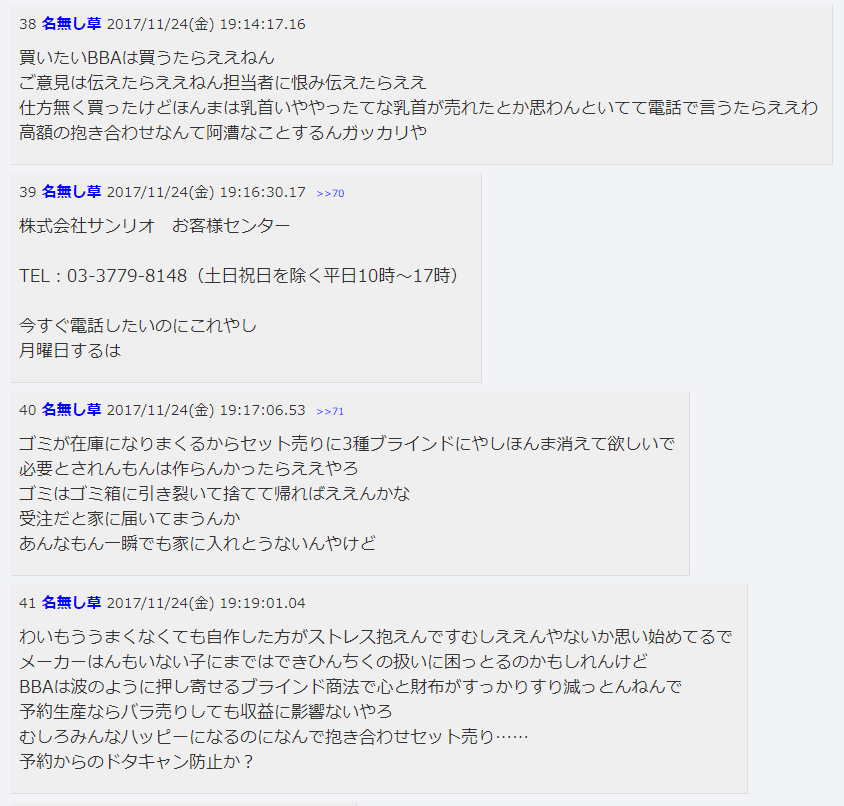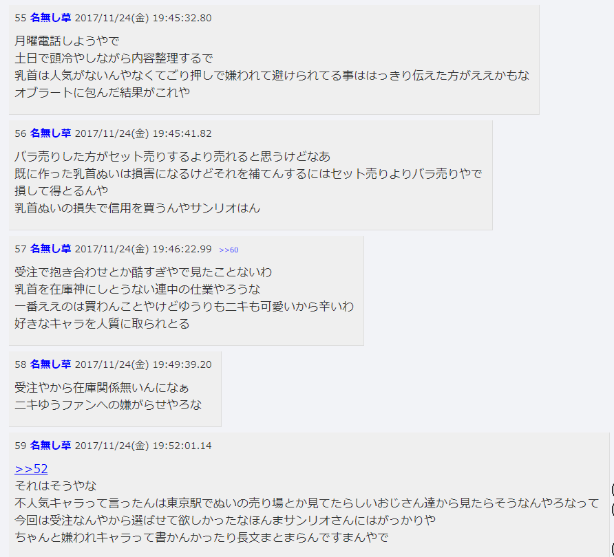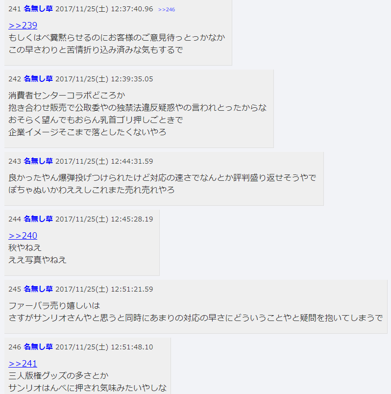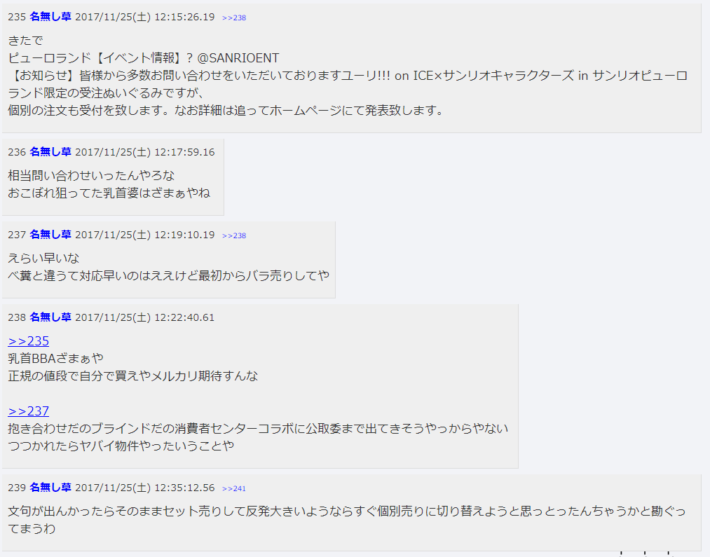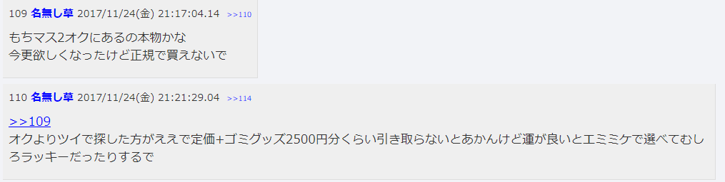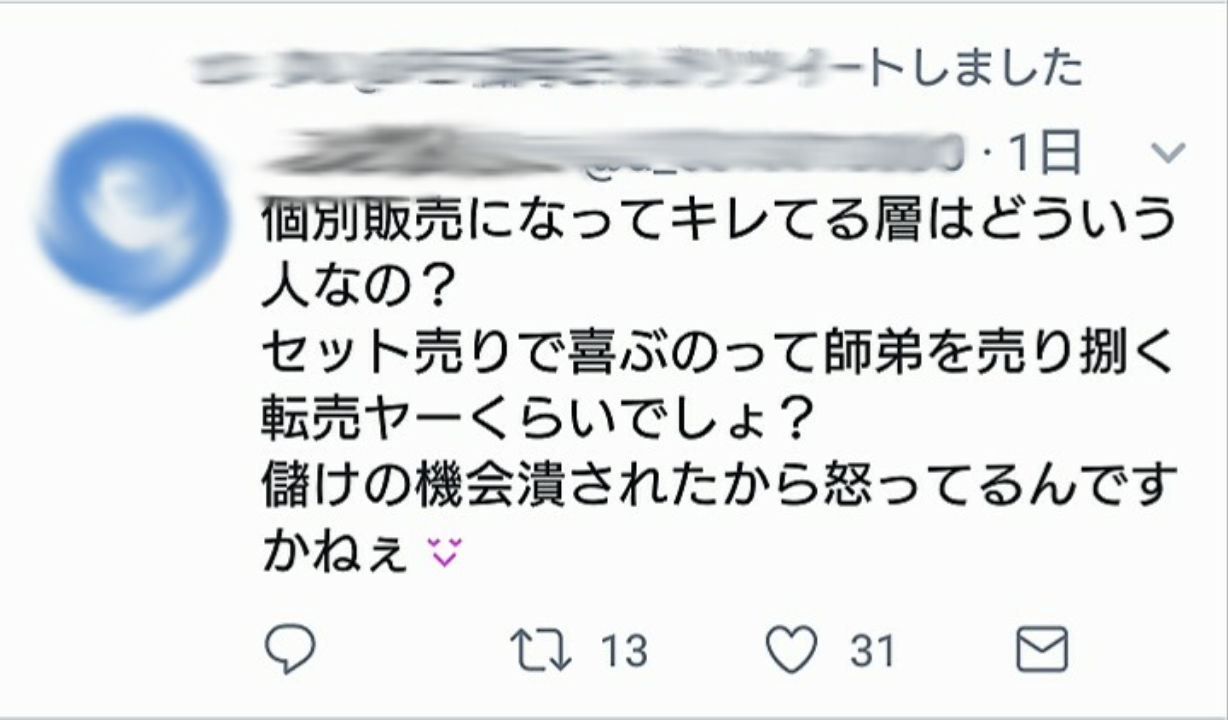 ヤフオクやグッズ交換の話。正規価格で買う層だから、メーカーに文句を言うわけではないらしい。どういう層が凸撃するのかよくわかる。