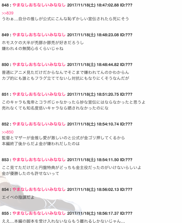▲上記は「流行旬ジャンル他について外野がわいわい言う」スレで、そのタイトル通り住人はジャンル外の人間だ。そこに過激派が出向いて印象操作に躍起になっている様子が伝わる。「金」というのはユーリ・プリセツキーのこと。ありとあらゆる公式関連ツイートにぶら下がって悪態をついている自分たちが、ジャンル外からどうみられているのかを考えられる客観性もないのだろうか。