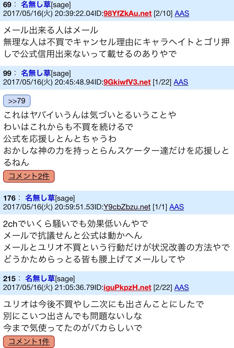 出来れば、雑談スレの住人が言うように荒らしであってほしいのだが、幕張や神戸、新潟のスケートリンクで行われた大規模なアイスショー出演のために、各国から有名プロ・アマスケーターが訪れた際のこと。過激派の一人がとある海外のスケーターに「ヴィク勇が冷遇されている」と手紙で訴えたというレスが投下された。