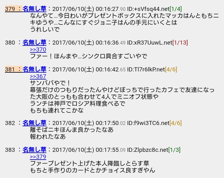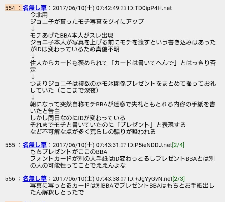 仲間のプレゼントの画像がアップされたことに祝福ムードのスレ内だが、プレゼントしたと思われる人物が「詳しく内容を言えない」手紙を一緒に送ったと告白。