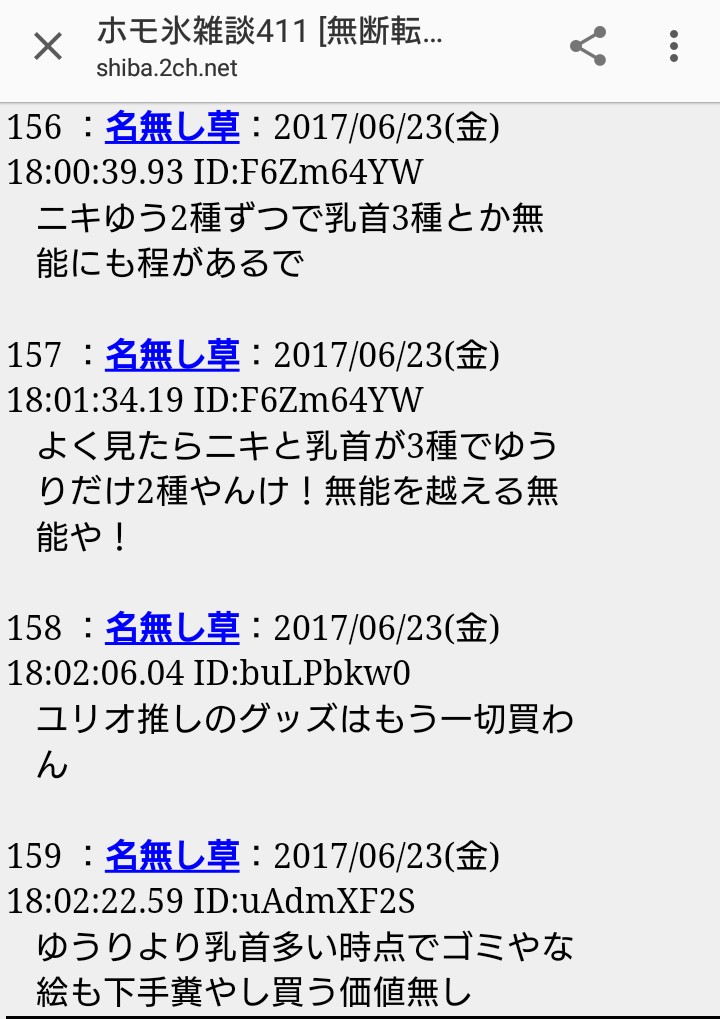 時折、「ユリオでいいじゃないか」「キャラdis禁止だろ?」などと虚しい反論を試みるあだ名呼び廃止の提案者にさらに畳み掛けるように「乳首」呼びを連呼。ついにはあだ名呼び廃止の提案者は「もう何を言っても無理だな」と出て行くことになる。(ホモ氷雑談435より)