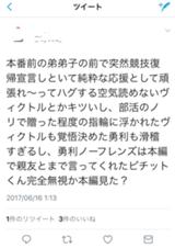 また4月末に行われた『ユーリ!!! on ICE』のイベント「ユーリ!!! on STAGE」パンフレット内でのユーリ・プリセツキーの原案紹介文を曲解し、アニメキャラであるユーリ・プリセツキーへの罵倒も過激さを増していった。