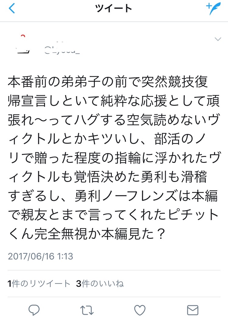 放送終了後、ファン層の中でも大きな分母を持つ「ヴィク勇民」、その中でも主人公勝生勇利の過激なファンが原案者のインタビューに怒る。