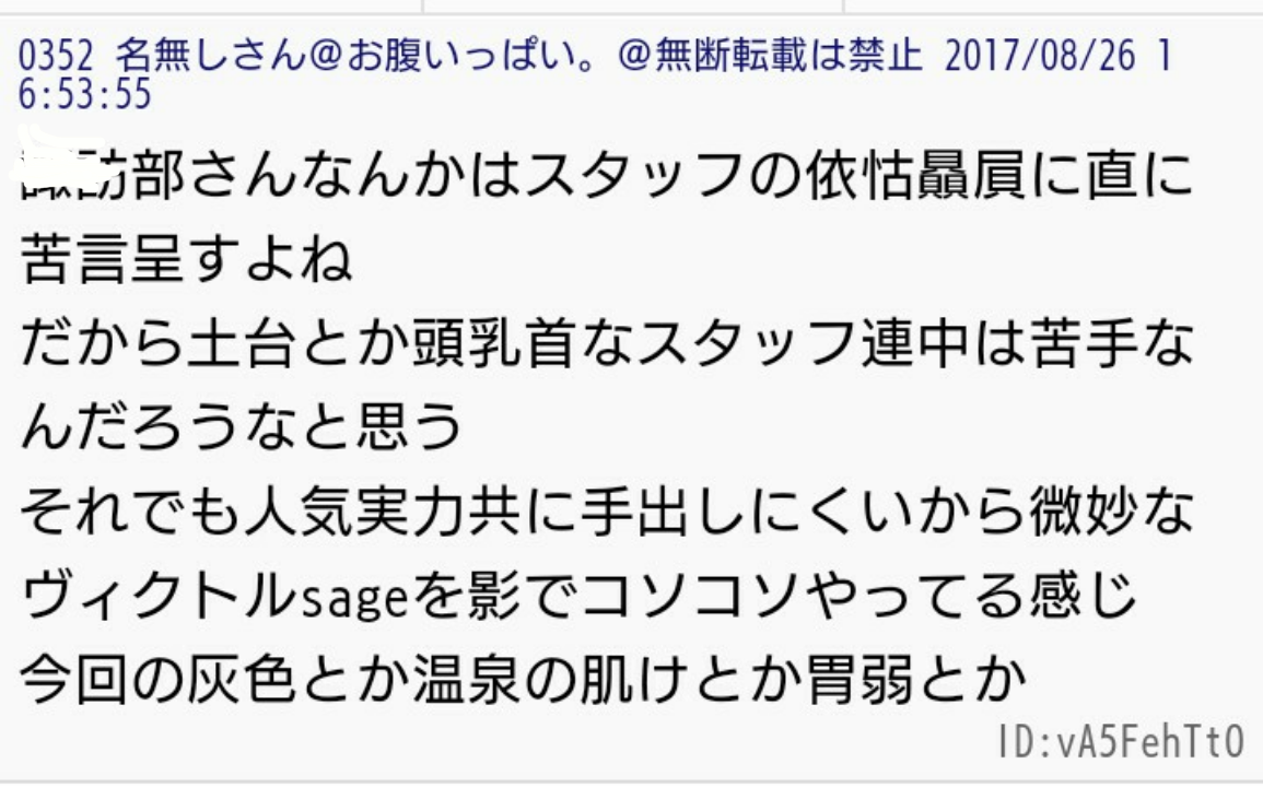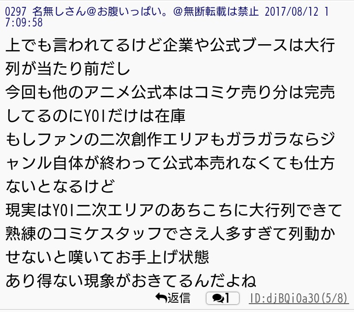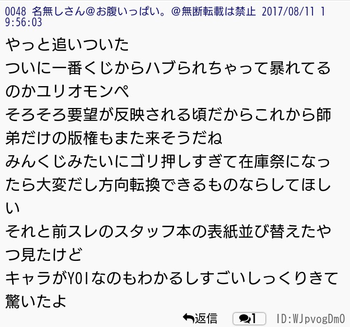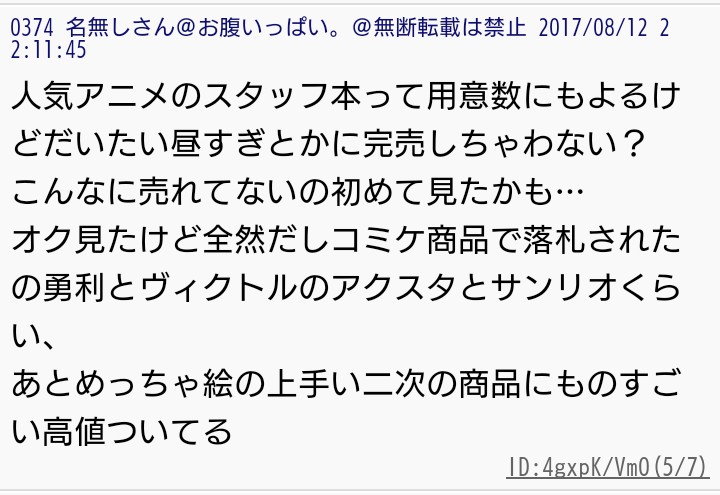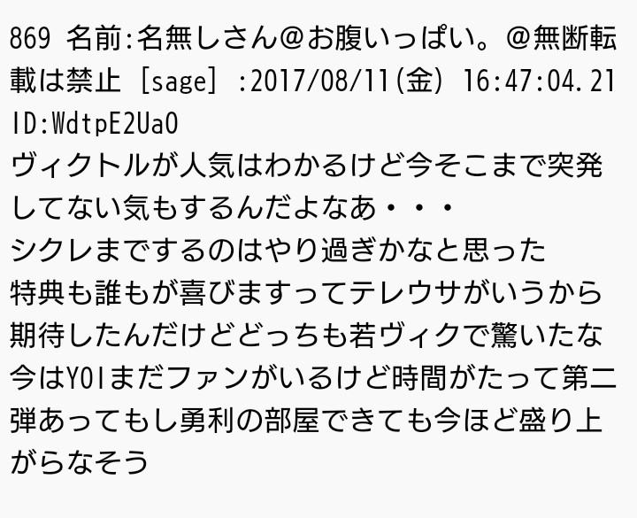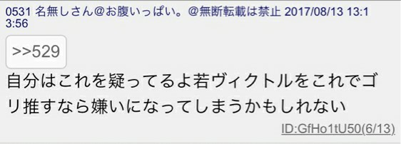 2017年8月中旬現在、過激派の関心は先日行われたコミックマーケットの公式本と現在開催中のミュージアムの若ヴィクトル(コーチヴィクトルの若い頃)にあるようだ。