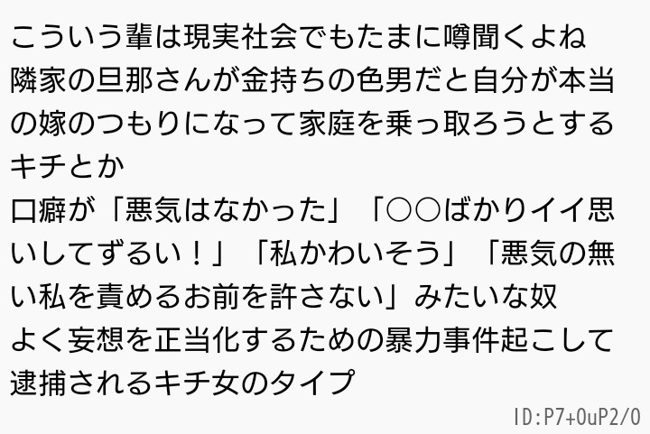 口調は比較的普通だが書き込む内容は憶測と関係者への中傷に満ちている。「監督と原案の仲が女同士にありがちな上部だけのもの」「婚活」「男性声優を狙っている」など女性らしいゴシップじみた中傷も特徴。2ちゃんねるだから人間性剥き出しでも構わないと考えているらしい。
