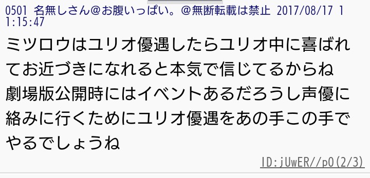 以来公式を非難するレスが本スレを荒らすようになり、そのうち荒らしがワッチョイ無しのスレを同じくアニメ2板に立てたので、不満を言いたい層(過激派)がそのまま居着いて現在に至る。